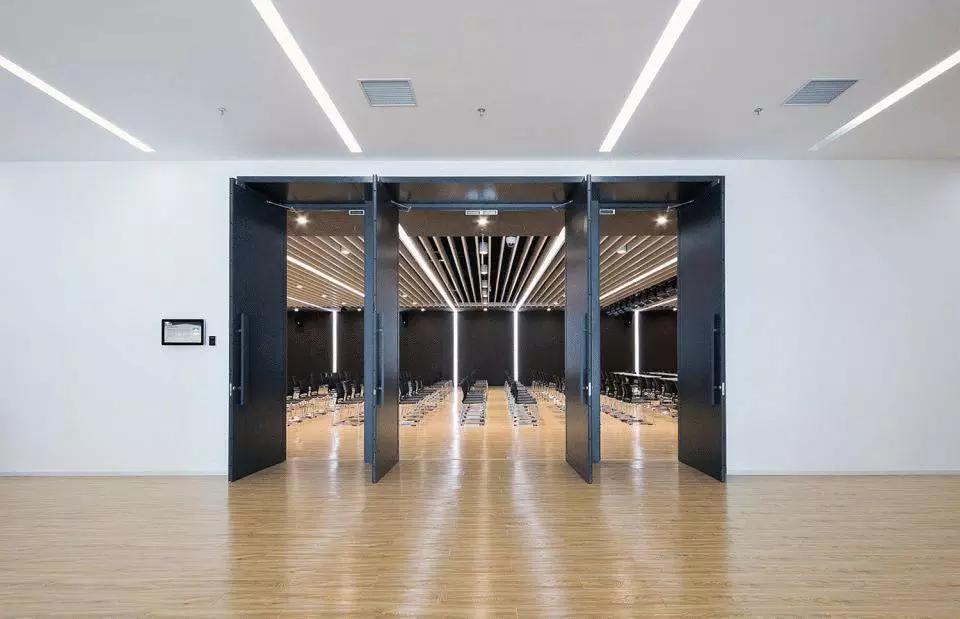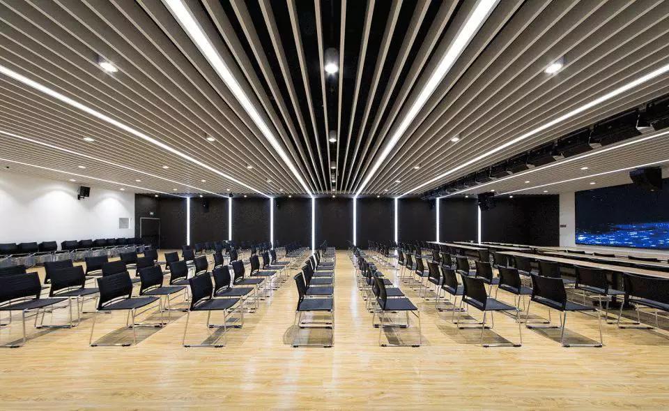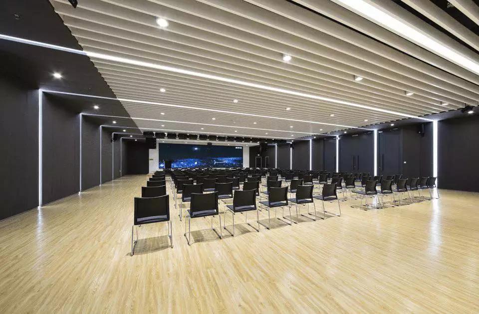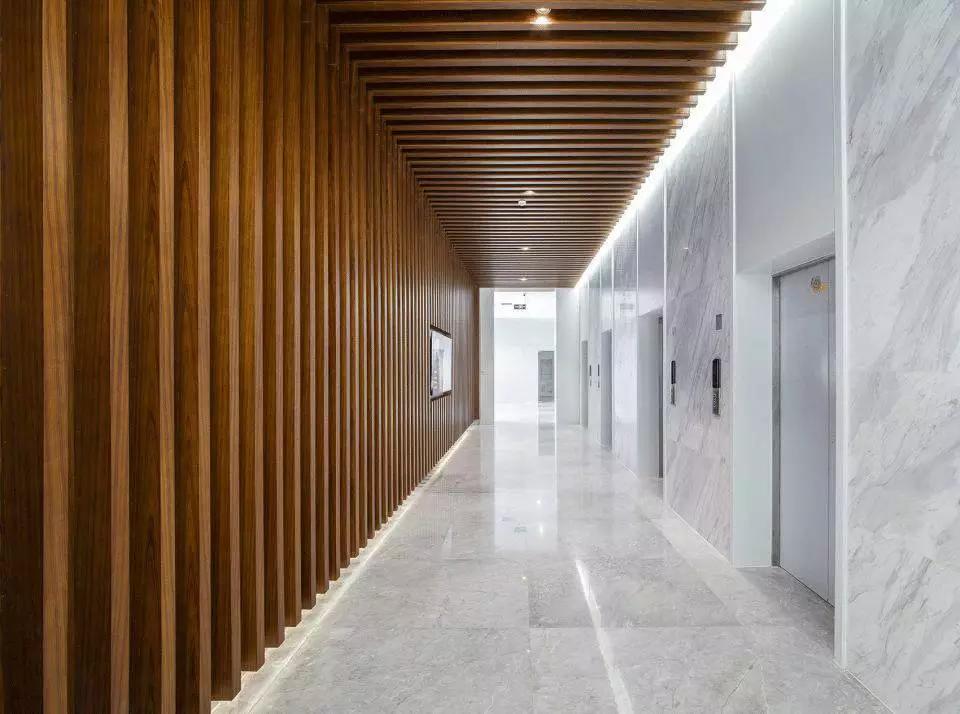 不同的空間內(nèi)容對應(yīng)不同的材質(zhì)氛圍,從色彩到質(zhì)感,再到意象化的裝飾,我們依據(jù)大堂、會議、休息室、中庭等不同空間尺度與空間內(nèi)容營造新穎豐富、恰如其分的空間氛圍。溫暖的木色、混凝土板、白色大理石和白色乳膠漆為主要材料,其中報(bào)告廳大異其趣,優(yōu)雅高貴的深灰色布藝軟包與報(bào)告廳的相對集中和封閉性相得益彰。我們依托原有建筑空間序列,如大堂-電梯廳-等候區(qū)-多功能廳-VIP室-展廳,調(diào)整改變室內(nèi)設(shè)計(jì)的溫度與濃度,為原本純功能理性化的空間組織蒙上一層魅力面紗,讓功能化的“經(jīng)過”變?yōu)橐淮尾簧岬鸟v留與感受。