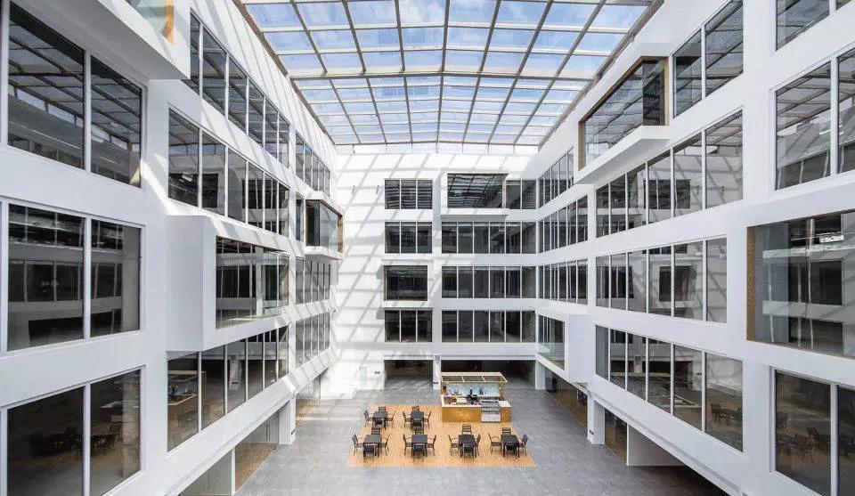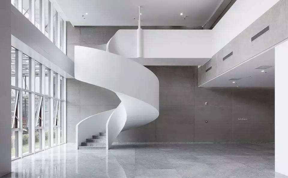從中庭的自然光到室內(nèi)的人工光,大廈的光影在豁然開朗和細(xì)致入微之中不斷變換。中庭必須和天空有所交流,尤其是霧霾肆虐的今天,藍(lán)天顯得特別稀有,在中庭上方加蓋玻璃幕墻為上策。流空素影正翩翻,使得存在于強(qiáng)烈靜態(tài)空間體驗(yàn)中的人又能同時(shí)感受到光影與云卷云舒的動(dòng)態(tài)變化。在典型的辦公樓層,小型私人會議室從中庭立面懸挑而出,并錯(cuò)落有致,打破了中庭的單調(diào),并增加了最小辦公空間的面積。一側(cè)的螺旋樓梯飄逸靈動(dòng),用混凝土演繹出的獨(dú)特輕薄感如風(fēng)裳皎立,引辦公的人們靈感興發(fā)。